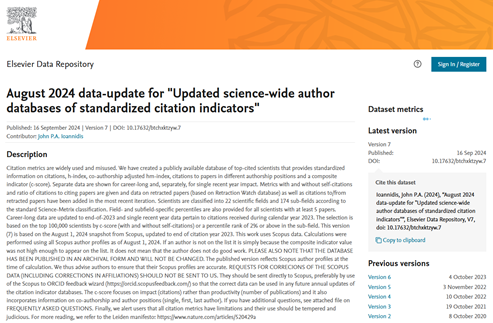 该榜单由斯坦福大学John P. A. Ioannidis教授团队与Elsevier旗下MendeleyData发布,基于Scopus数据库,使用了如下六种关键因素的指标来进行打分:(1)总引用量;(2)HirschH-index;(3)共同作者修正的SchreiberHm-index;(4)单独作者;(5)单独或者第一作者;(6)单独、第一或者最后作者的文章引用量。此数据提供了一个面向科学家长期科研表现的衡量指标,能够更客观、更真实的反映科学家的影响力。