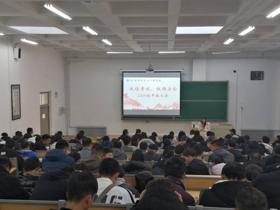 期末考试将至,为动员同学们诚信应考,12月7日下午,太阳成集团tyc151cc在彭家坪校区集贤楼(原二号楼)308教室组织举办了以“严肃考风考纪、诚信应考”为主题的动员大会,此次动员会由辅导员汪甜甜老师主持及主讲,2019级全体同学参加。