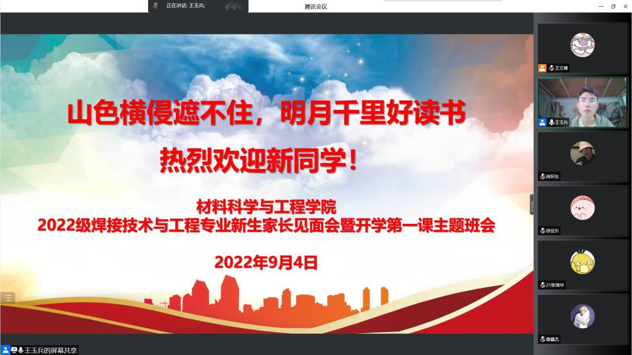 为落实公司疫情防控统一安排部署及线上教学工作安排,全力筑牢疫情防控防线,教育引导新生尽快适应老员工活、进入学习状态,切实保障新生生活学习顺利开展,太阳成集团tyc151cc于9月3日-4日组织召开各新生班级线上家长见面会暨开学第一课主题班会。