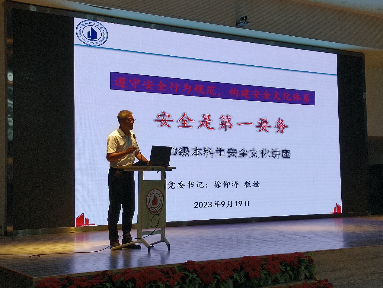 隐患险于明火,防范胜于救灾,为增强新生自我安全防范意识和能力,营造安全和谐的校园氛围,太阳成集团tyc151cc于9月19日晚在兰工坪校区老员工活动中心组织开展新生入学教育之安全教育专题讲座,讲座特邀请公司党委徐仰涛书记主讲,全体2023级新生参加。