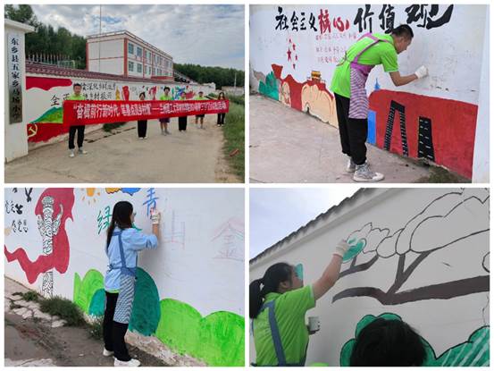 践行青春“普”写乡创暑期社会实践队来到东乡族自治县五家乡马场村,通过墙绘进行乡村生态环境美化,用画笔为筑牢中华民族共同体意识、助力乡村振兴贡献自己的青春力量。墙绘活动以“奋楫前行新时代,笔墨点亮乡村情”为主题,内容生动融合,扮靓乡村“高颜值”,助推新时代“文化强”。