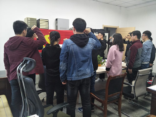 会议开始,全体党员起立面向党旗重温入党誓词。