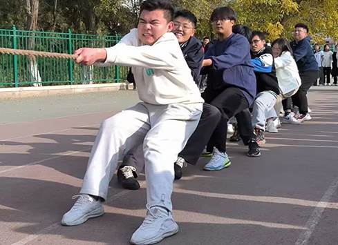 本次比赛各支队伍需派出男生10人,女生5人进行比赛。裁判哨声未响,上场对阵的队伍就蓄势待发的做好了拔河姿势准备迎战。哨声响后,各支队伍比赛时都涨红了脸、卯足了劲拼命的往后拉,未参赛的同学都扮演啦啦队的角色为自己的队伍加油鼓劲,整个比赛期间选手们高喊“一二一”的节奏声夹杂着拉拉队员的加油声以及观众的喝彩声在田径场上此起彼伏,异常热烈。