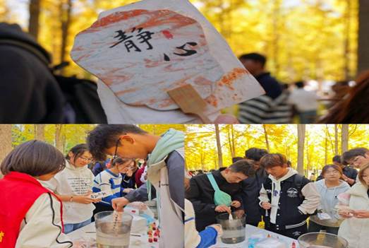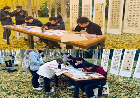 两委会还特别邀请公司墨研月书画协会和手工云剪纸协会,在银杏林中展示优秀书法作品及剪纸作品,同学们在银杏林中学习书法和剪纸技巧,感受中华优秀传统文化带来的文化沁润。